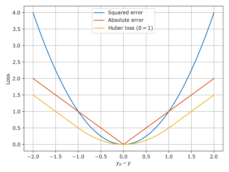 $$ L_\delta(y, f(x)) = \begin{cases} \frac{1}{2}(y - f(x))^2 & \text{for } |y - f(x)| \leq \delta, \\ \delta |y - f(x)| - \frac{1}{2} \delta^2 & \text{otherwise.} \end{cases} $$
